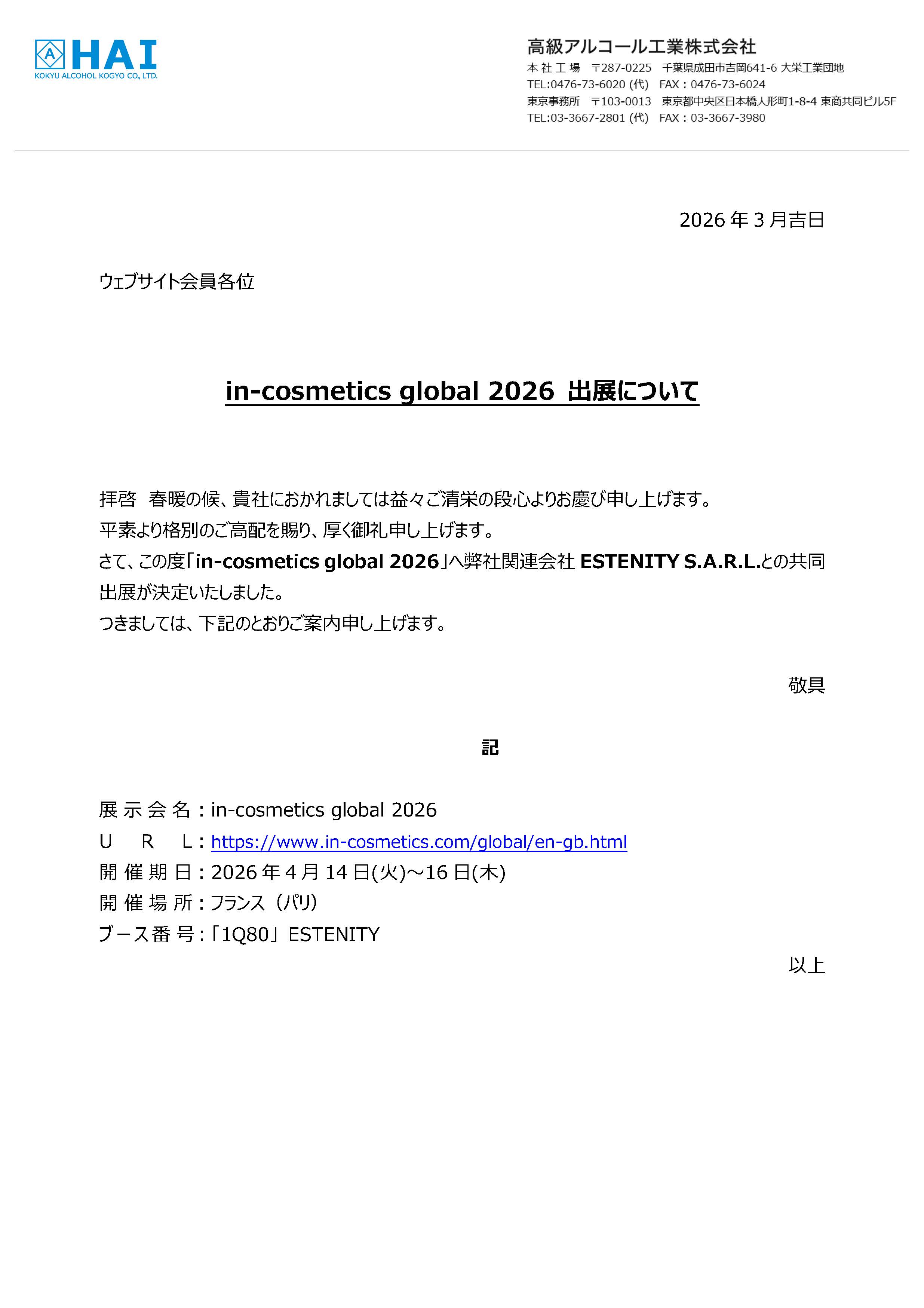 in-cosmetics global 2026 出展について