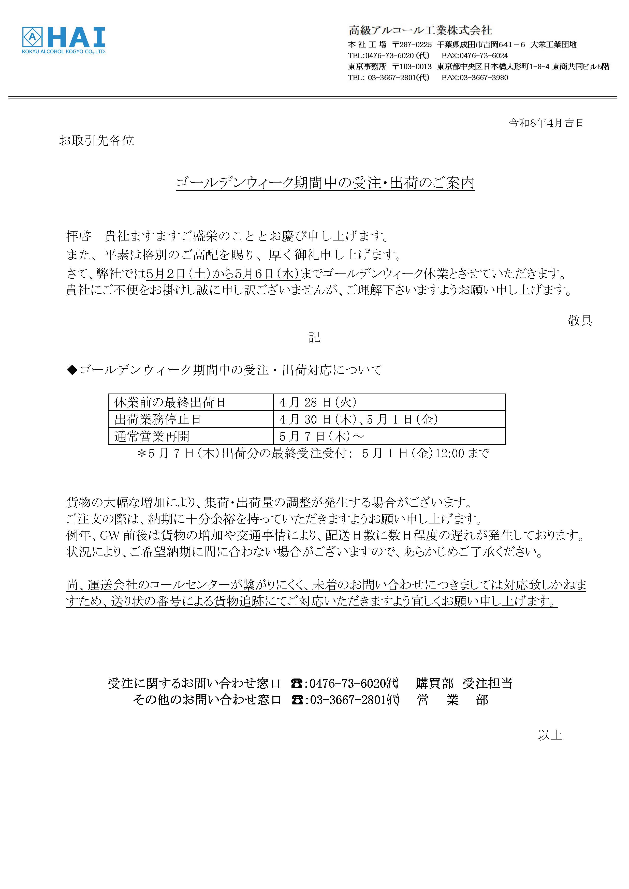 ゴールデンウィーク期間中の受注・出荷のご案内